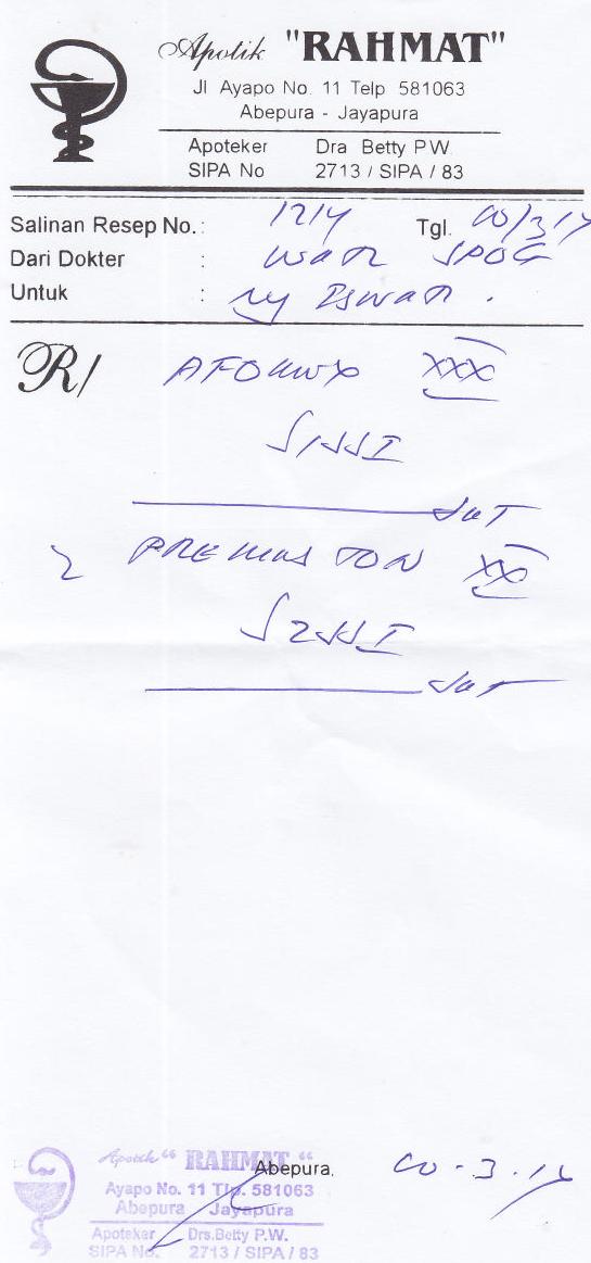 Artinya resep bisa ditebus sebanyak 2x, dimana satu kali dengan menggunakan. Ang yu lie copy resep iii iter . Gambar 9.2 contoh salinan resep. Copy resep ii iter 3x r/ paracetamol 200 mg equal qs mf cap dtd no. Detur 2 x pro : Tidak lengkap, apoteker harus menanyakannya kepada dokter penulis resep tersebut. Penulisan resep dokter bertujuan untuk memudahkan pelayanan kesehatan. Melakukan pembuatan sediaan obat sesuai resep dokter. Contoh alat kesehatan yang hanya dapat diperoleh dengan resep dokter adalah. Contoh bentuk resep dokter adalah sebagai berikut : Dokter dapat menghendaki agar resepnya dapat diulang, apabila suatu resep dikehendaki untuk diulang maka pada resep tersebut ditulis kata "iter/ . Definisi resep permintaan tertulis dari dokter kepada apa untuk menyediakan dan menyerahkan obat bagi penderita sesuai dengan peratuan perundangan yang . 77 sia vii 2010 apa.